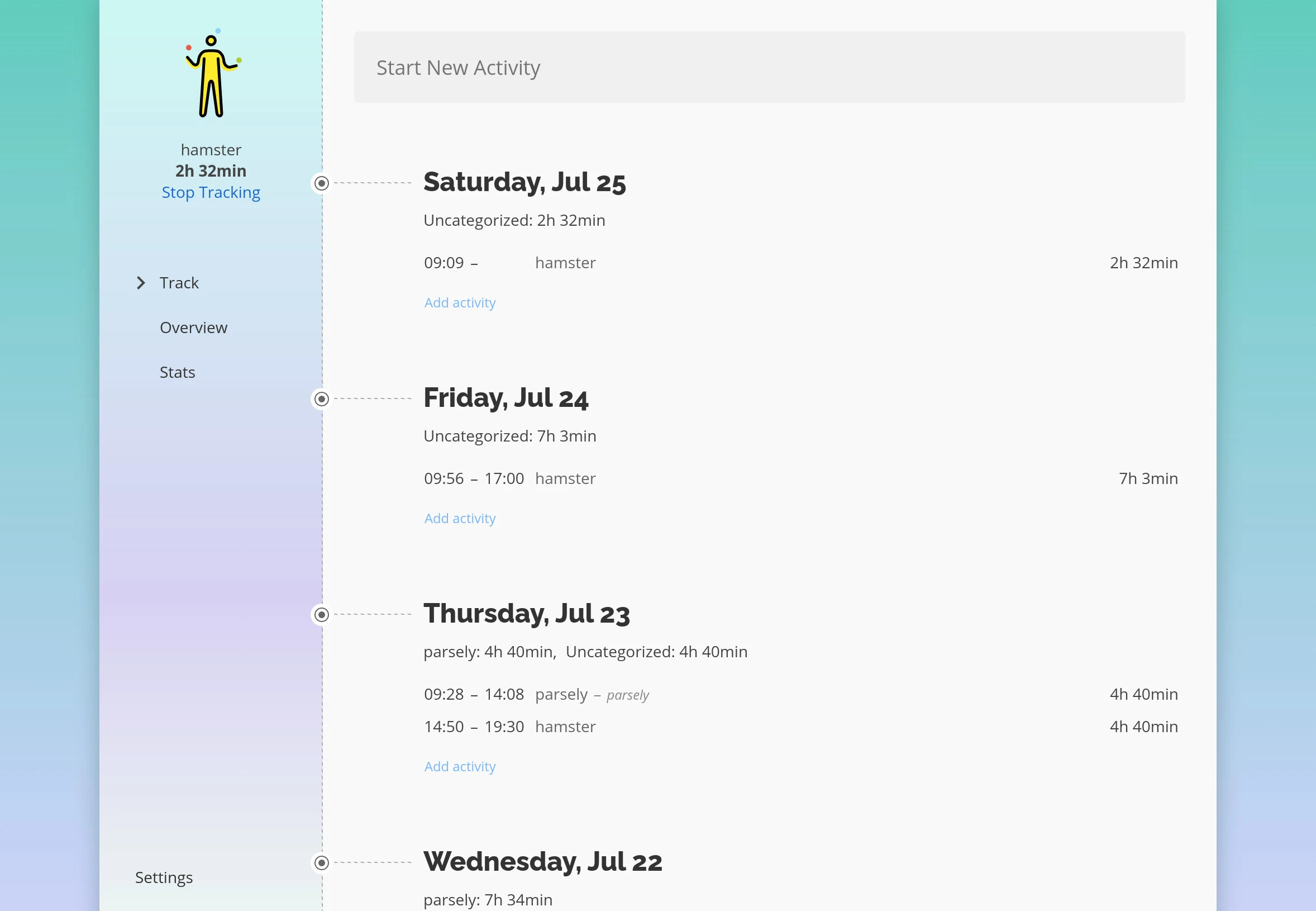 The concept is simple - you let hamster know whenever you start doing something, and at the end of the day hamster will be able to tell you how much time you spent on what.